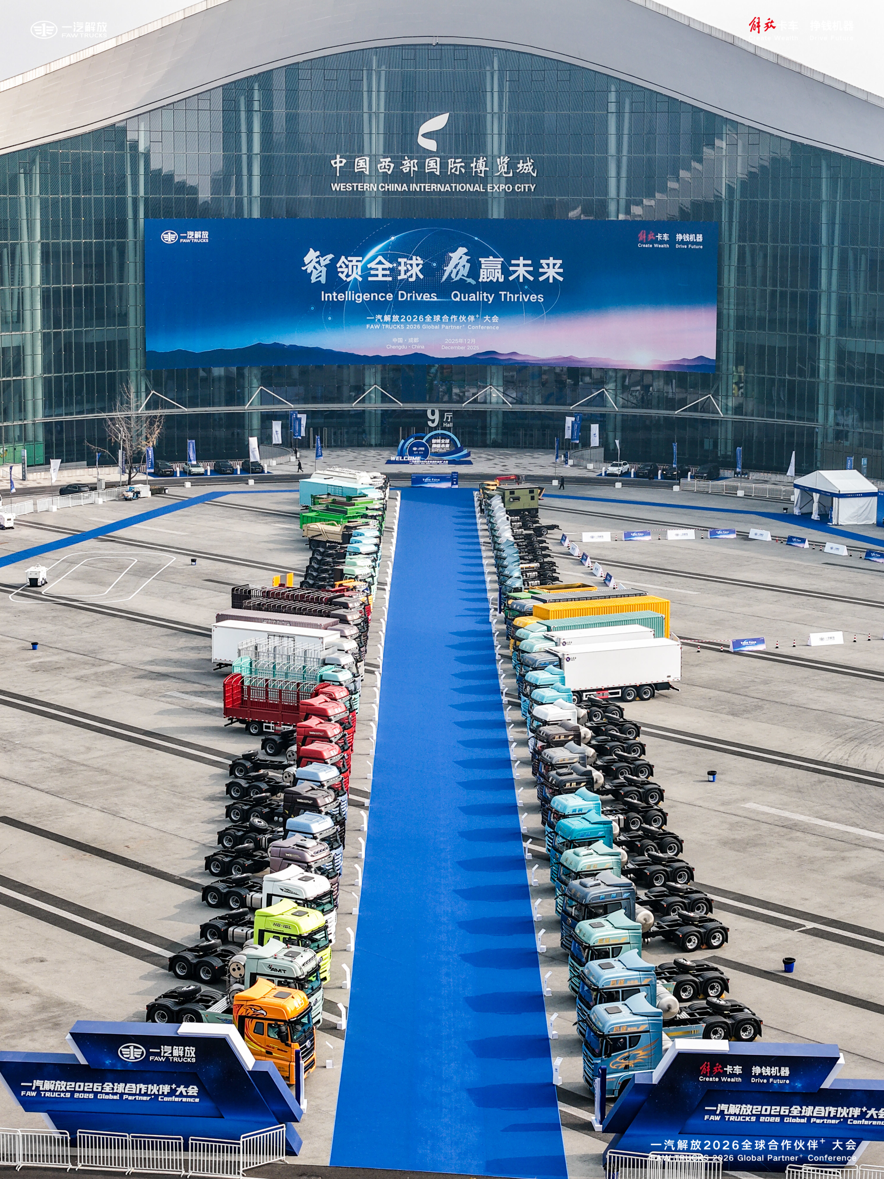 本次一汽解放2026全球合作伙伴大会规模空前,包含梦想合伙人大会、营销年会、采购年会等多场重磅活动及多个专项领域会议,展场面积超过13万平方米,现场展出解放整车228辆,全球核心供应商展区41个,参会嘉宾覆盖60个国家和地区,会议规模之大、参会人数之多、覆盖群体之全、展车展品数量之多、发布内容之重磅、行业影响力之强,均属历届之最。