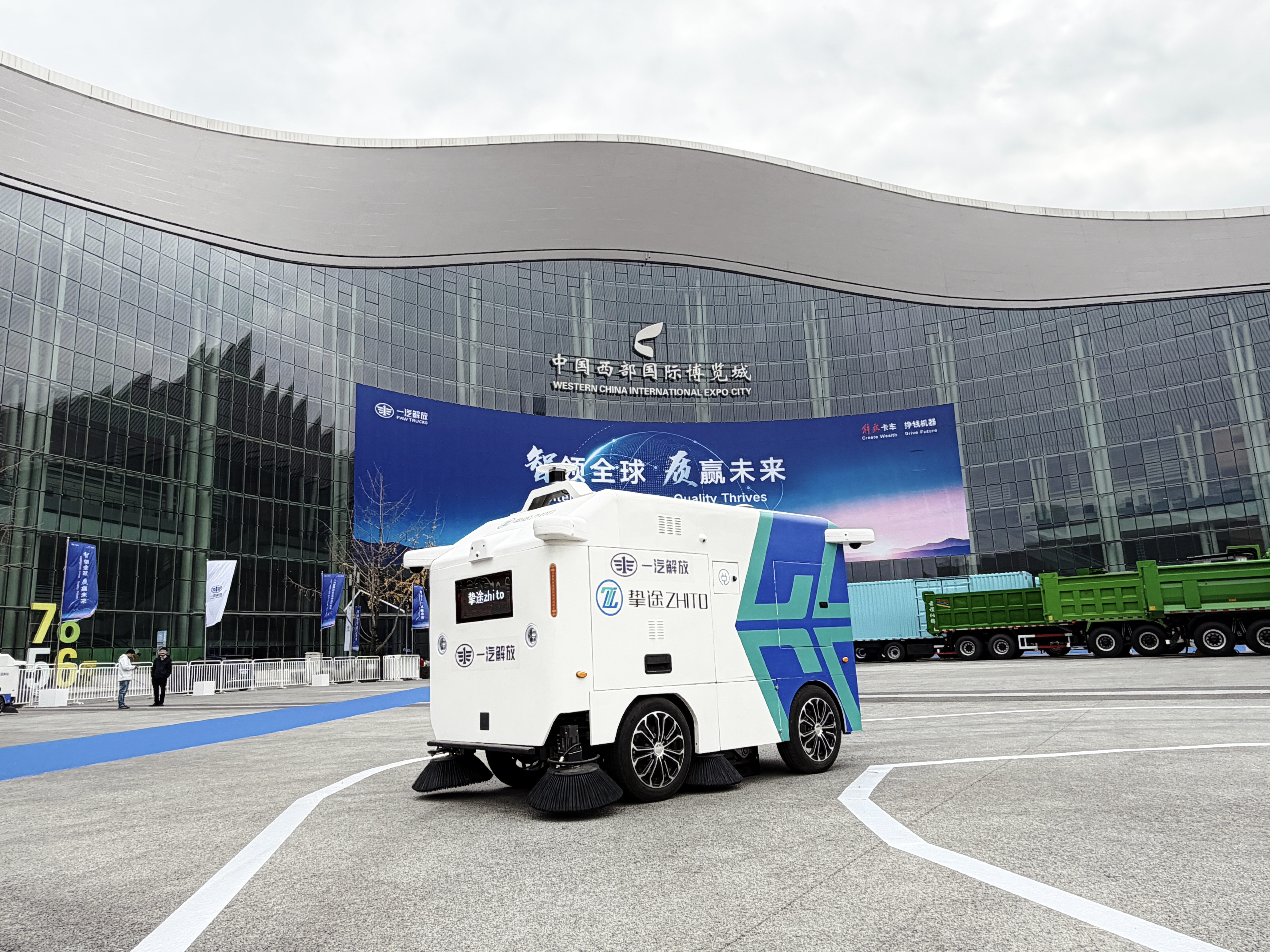 在室外展车区域,J6L智能洗扫车、挚途ZT240等整装待发,展示了挚途在无人环卫场景丰富的产品布局。